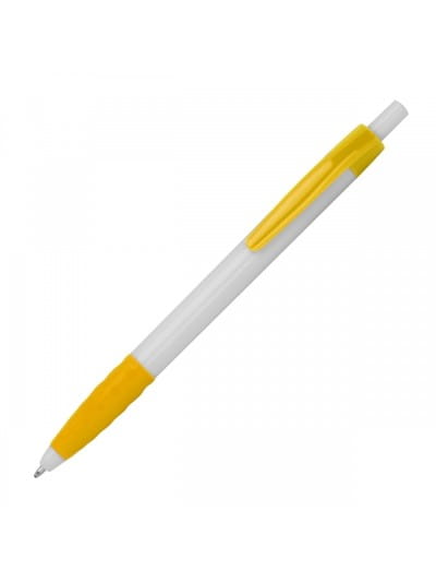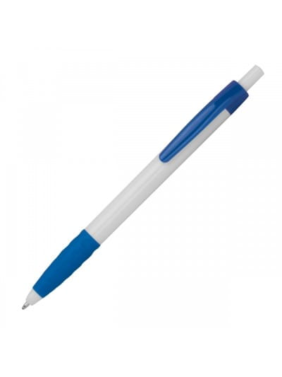 Plastikowy długopis z kolorowymi akcentami i gumową strefą uchwytu. Posiada wkład piszący na czarno.