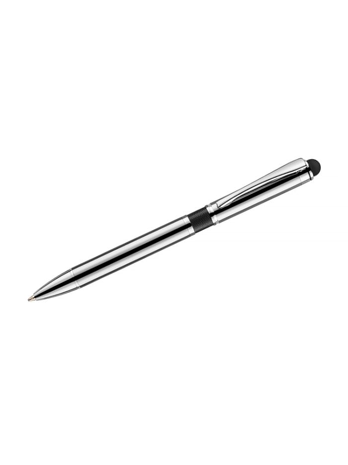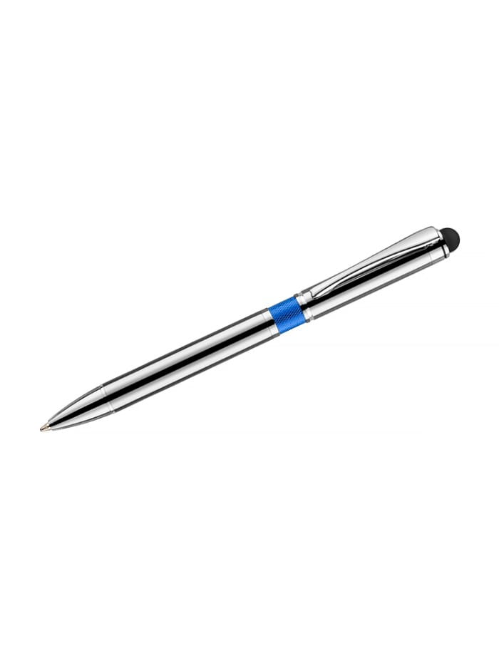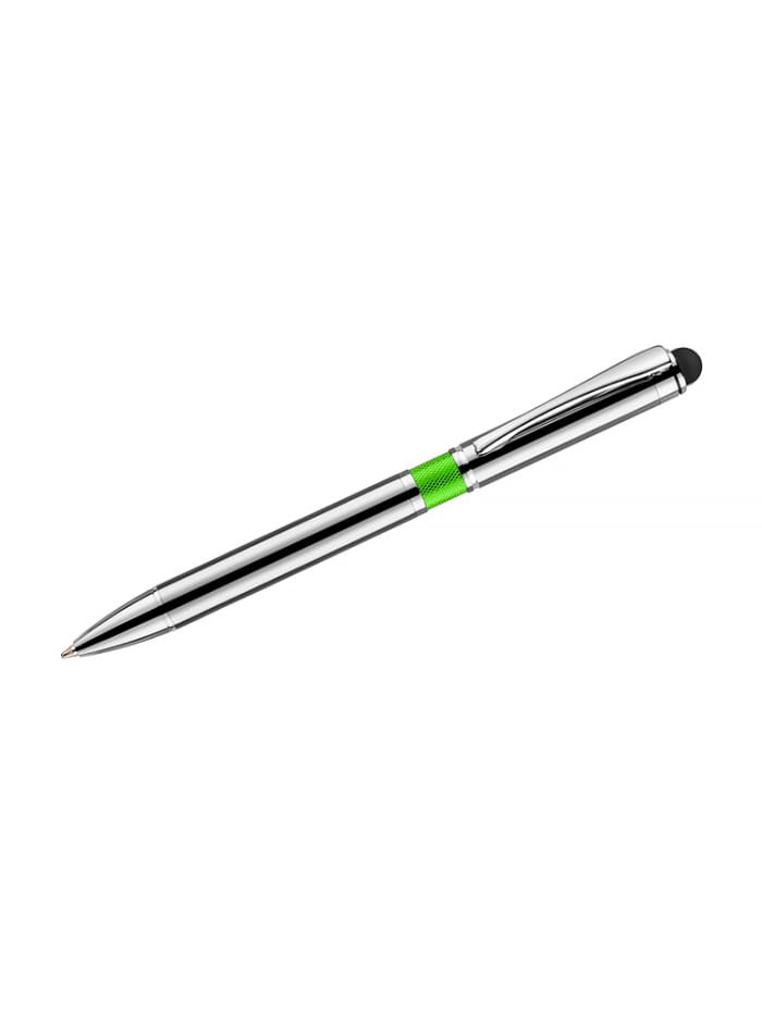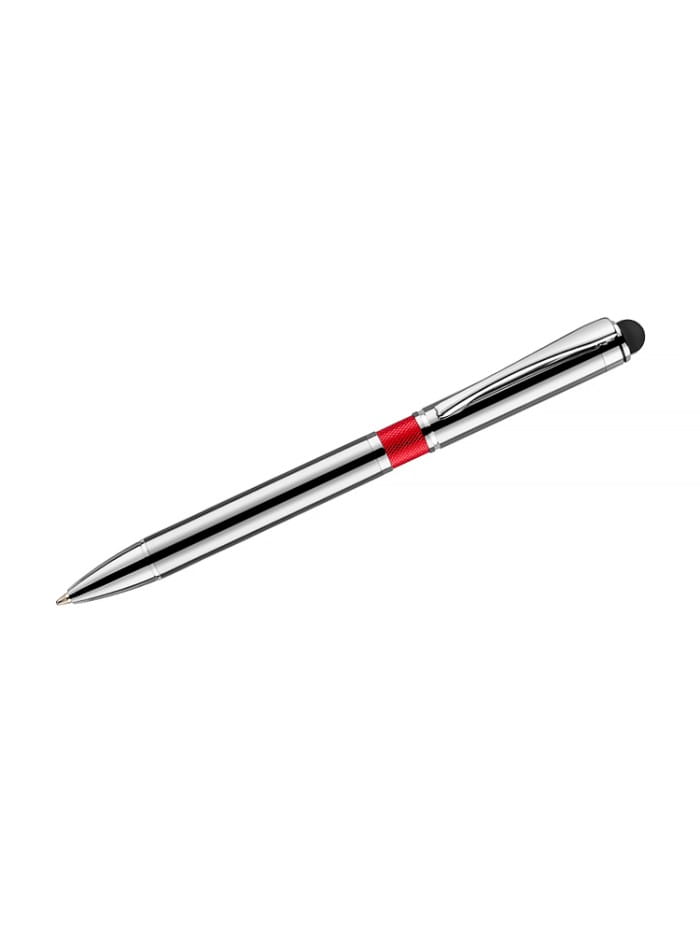Elegancki metalowy długopis z kolorową aplikacją na korpusie oraz touchpenem.