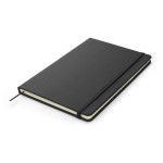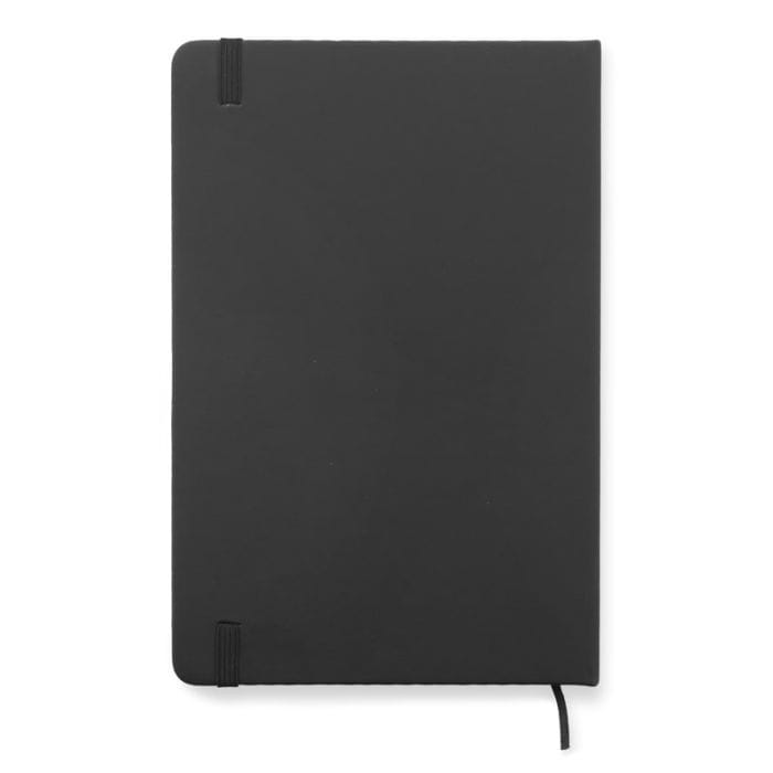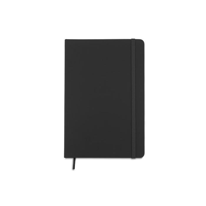 Gustowny notes A5 z kolorową gumką wykonany z materiału skóropodobnego (PU). Notes zawiera 80 kartek ecru w linie koloru pomarańczowego. Logo nadrukujemy na okładce.