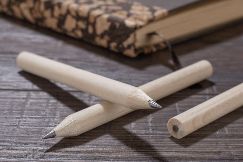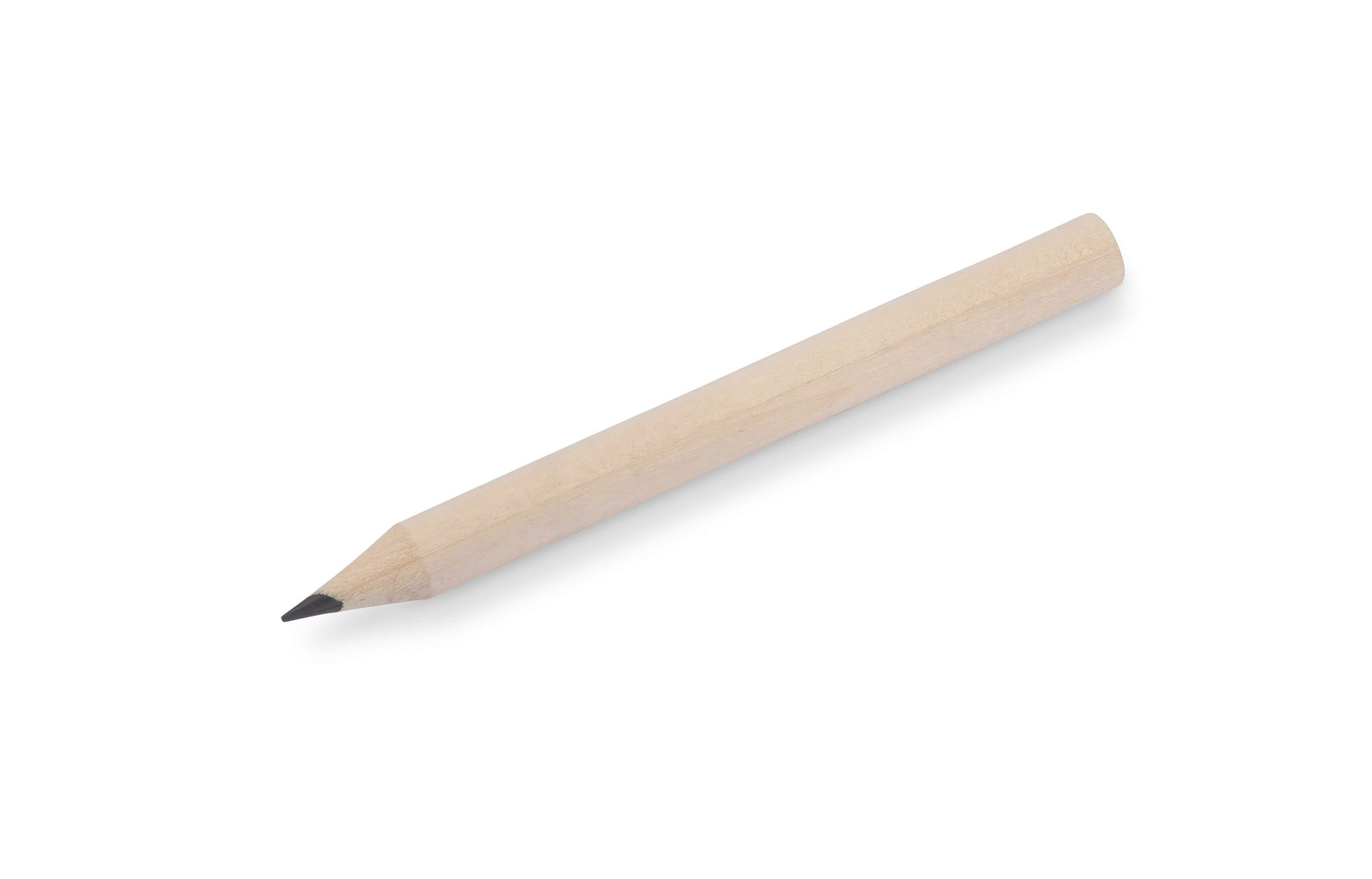 Krótki, drewniany ołówek IKKO z szeroką możliwością znakowania. Długość 8,5 cm. Ołówek zatemperowany.